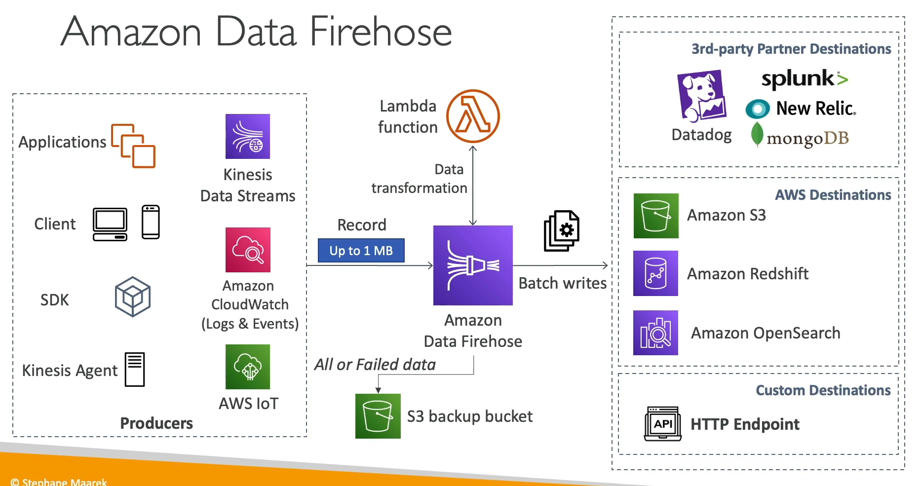 Decoupling ApplicationsAmazon Data FirehoseAmazon Data Firehose Automatic scaling, serverless, pay for what you use. Near real time with buffering capability. Custom transformations using AWS Lambda.